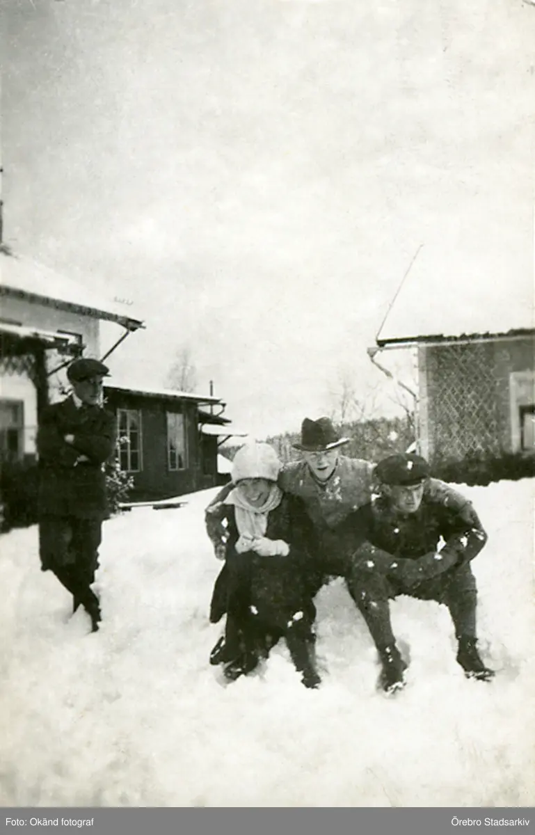 Fyra snöiga personer leker i snön vid Ulvshyttans herrgård, påsken 1915