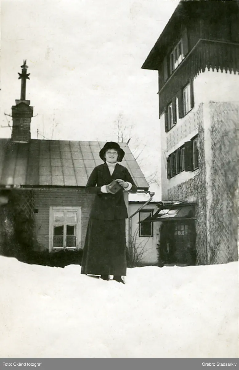 Ung kvinna med kamera vid Ulvshyttans herrgård, påsken 1915