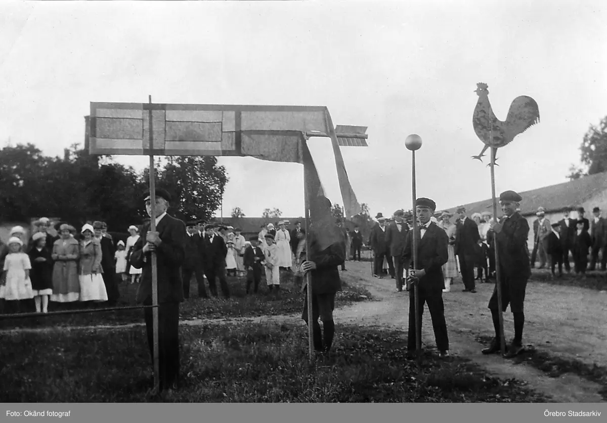De fyra pojkarna bär symbolerna som ska dekorera midsommarstången, tuppen, klotet, pilen och svenska flaggan. 1910-tal