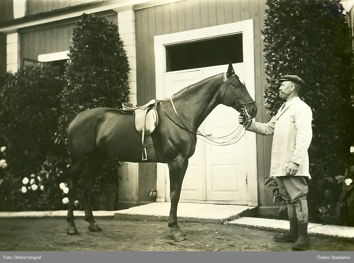 Man med sadlad häst på Bystad herrgård, 1910-tal