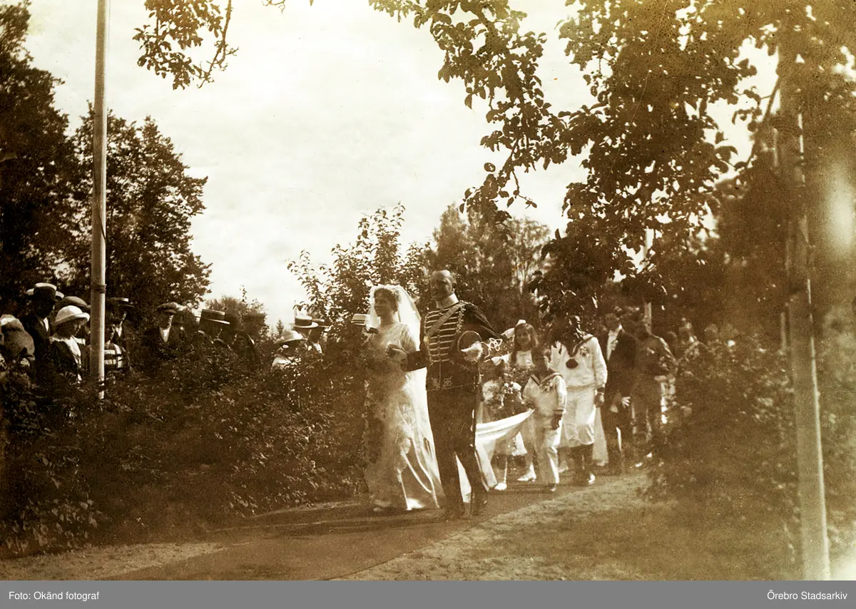 Brudpar med följe går genom parken till Färna herrgård, 1915-08-14