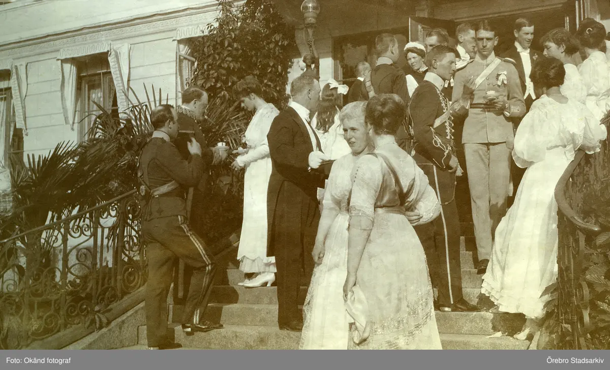 Bröllopsgäster samlas på herrgårdstrappan vid Färna herrgård, 1915-08-14