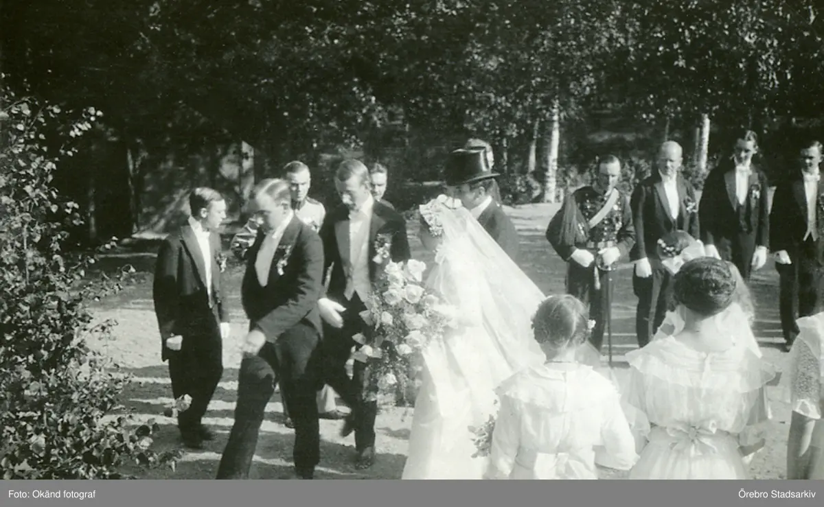 Brudparet passerar väntande tärnor och marskalker vid Ulvshyttans herrgård, 1915-08-30