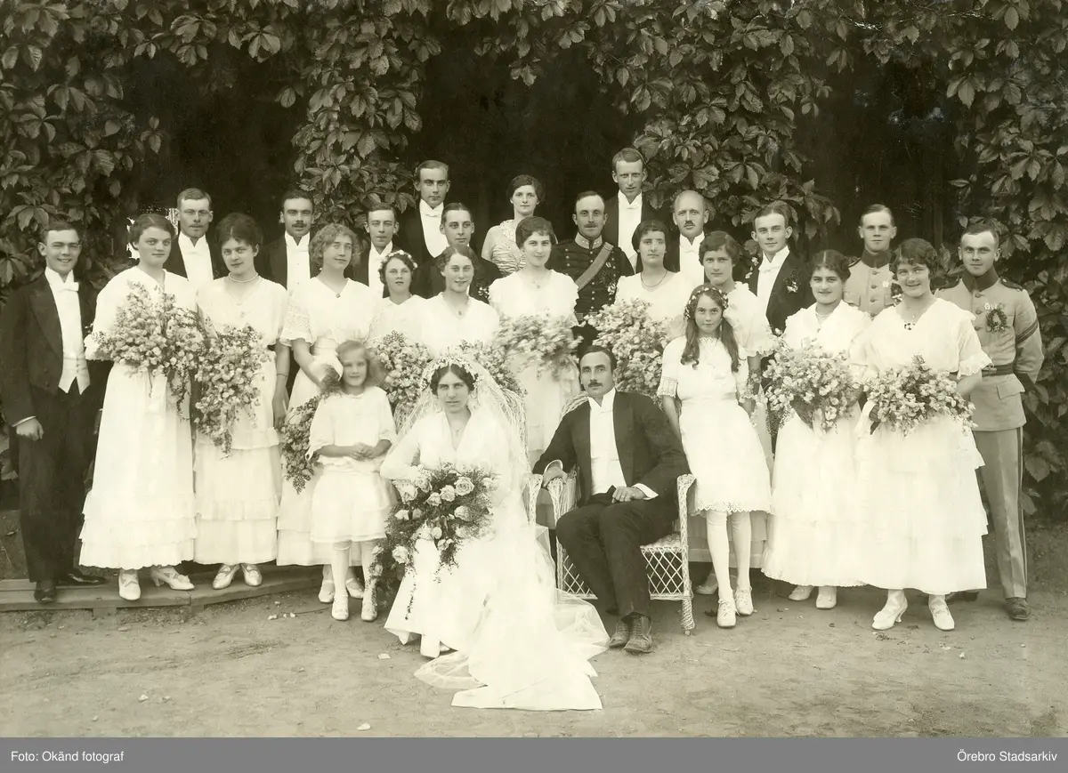 Brudpar med följe på Ulvshyttans herrgård, 1915-08-30