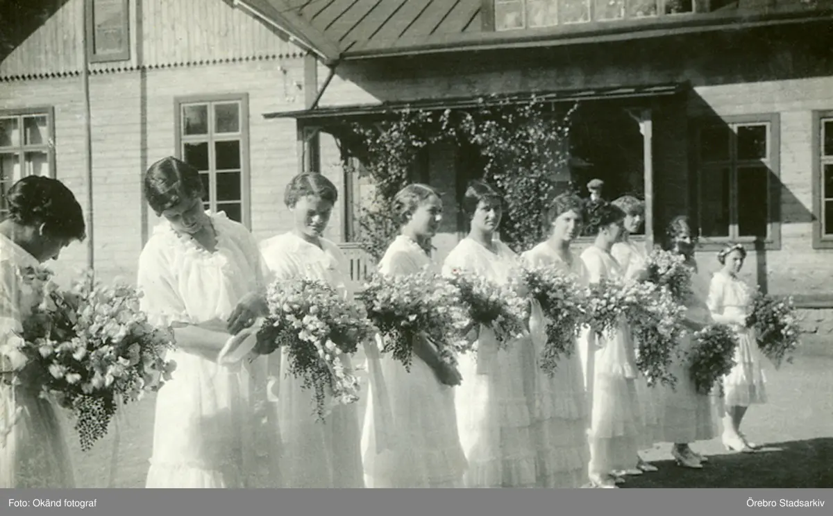Tärnor uppställda i rad vid Ulvshyttans herrgård, 1915-08-30