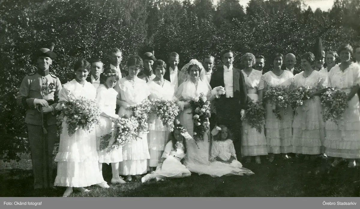 Brudpar med följe på Ulvshyttans herrgård, 1915-08-30