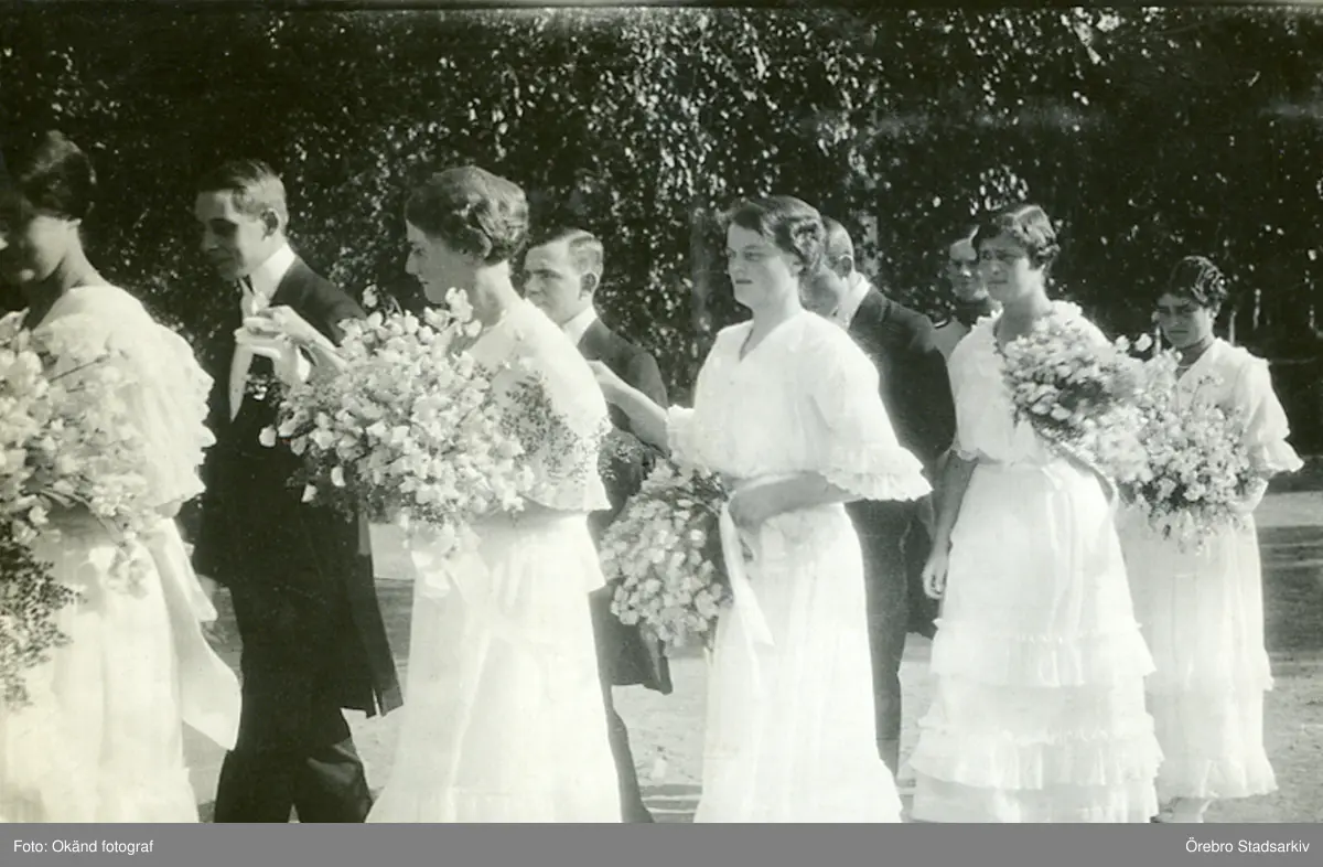 Tärnor och marskalker går parvis vid bröölopet på Ulvshyttans herrgård, 1915-08-30
