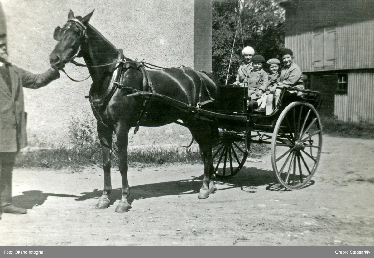 Fyra barn i gigg dragen av gårdens häst, 1920-tal