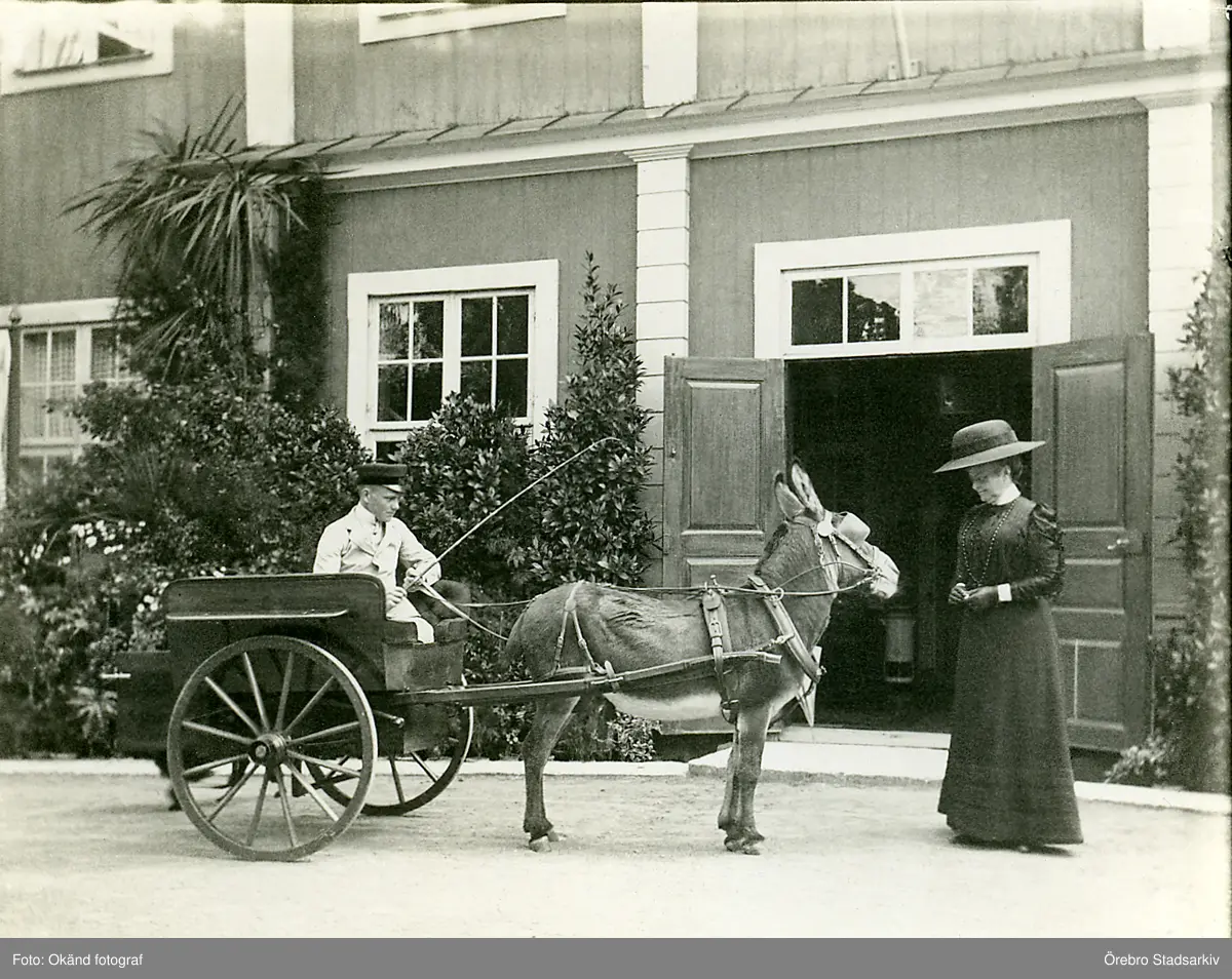 Mula med kusk och kärra på Bystad herrgård, 1910-tal