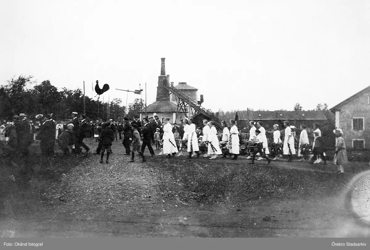 Brevens Hornmusikkår följs av fyra pojkar med symbolerna till midsommarstången och 14 kransflickor, 1910-tal