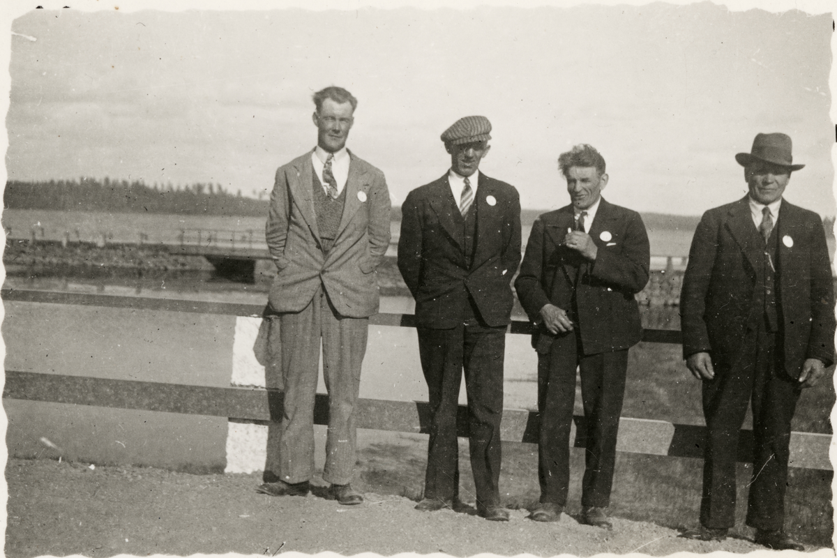Medaljörer på bro. Vägräcke med stengardister. Stenbro i bakgrunden.