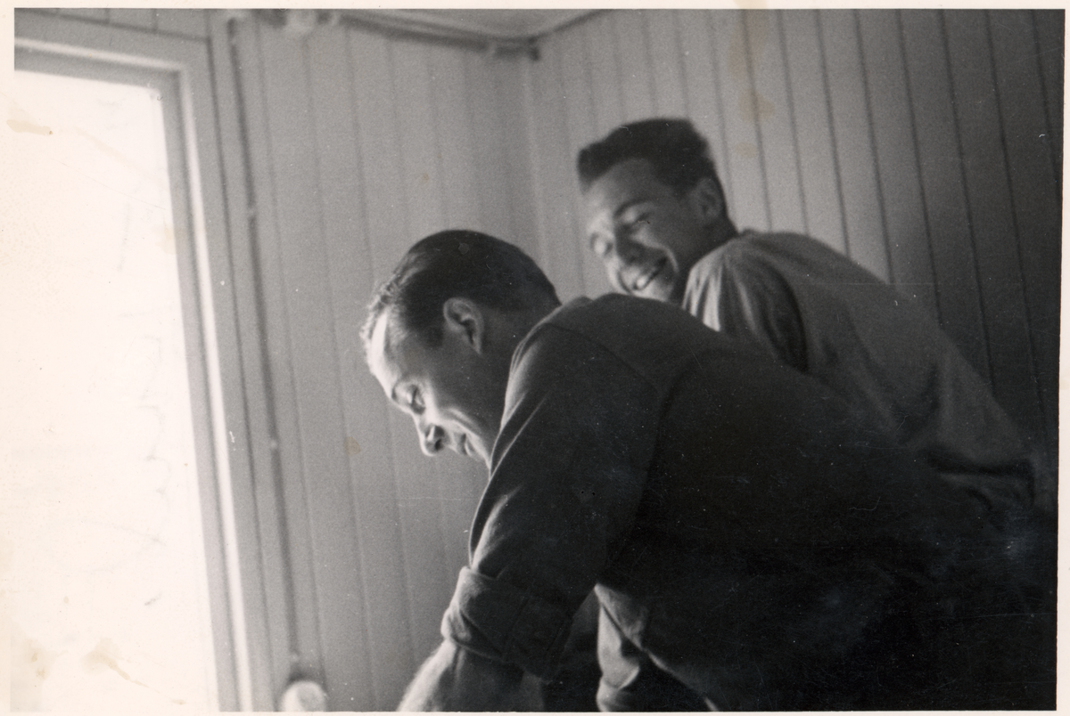 Två arbetare i arbetsbod. Arbete med viadukt vid Drottningsgatan - Rudbecksgatan.