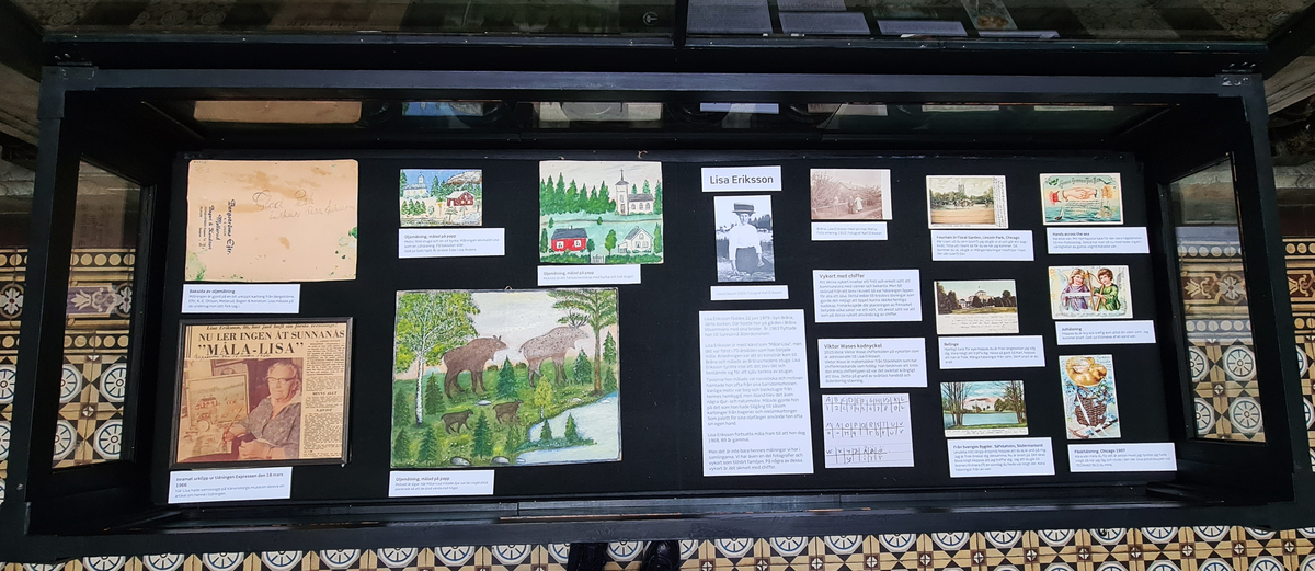 Vänersborgs museum, trapphallen. Tillfällig miniutställning om Lisa "Målar Lisa" Eriksson