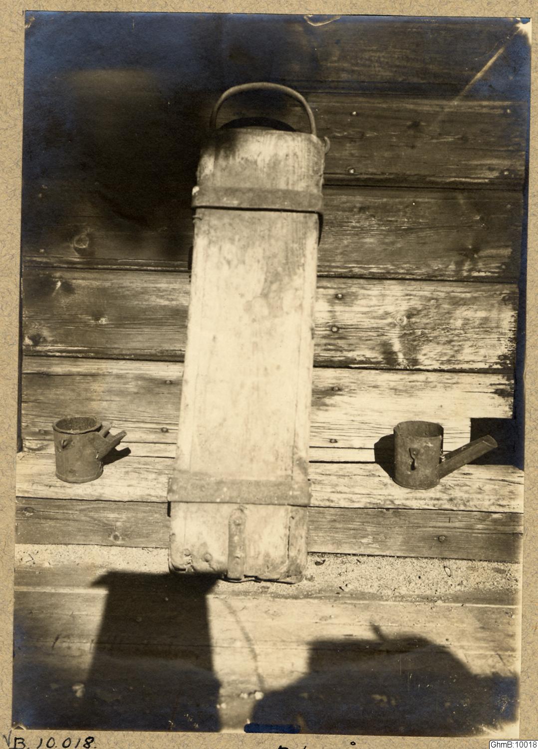 Fodral till borr för nedhissning i gruva, samt gruvlampor.