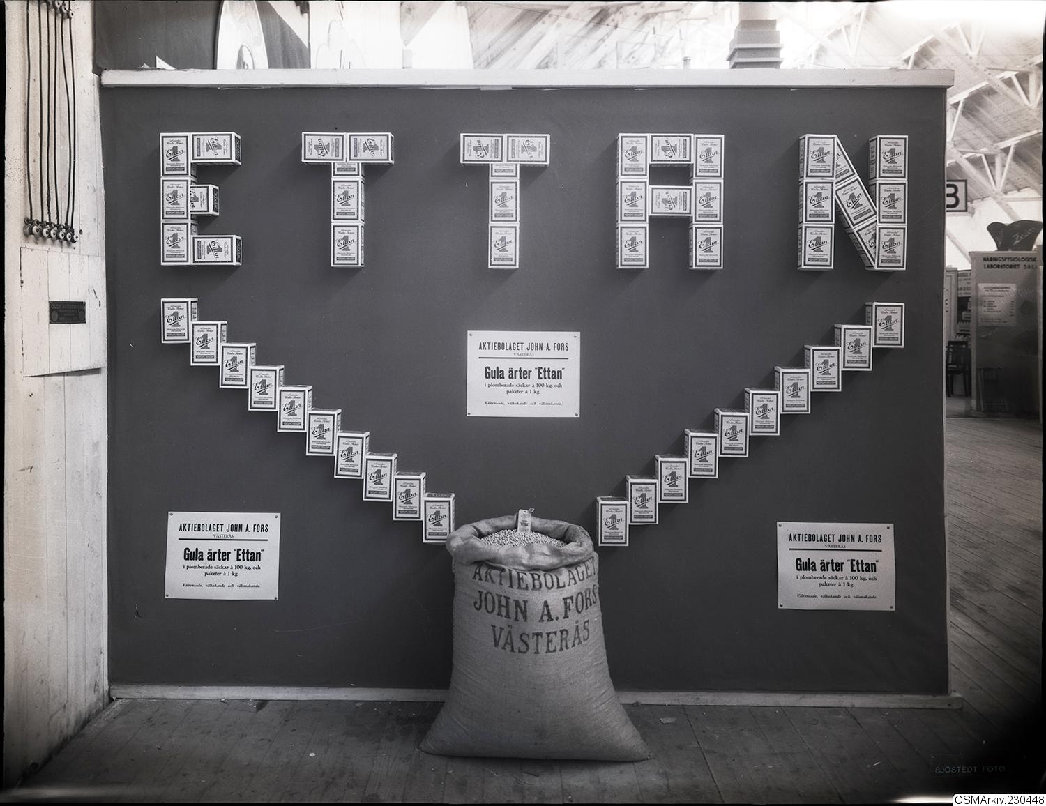 Svenska mässan, Göteborg vid Korsvägen, utställare Aktiebolaget John A.Fors, Ettans Gula ärtor.