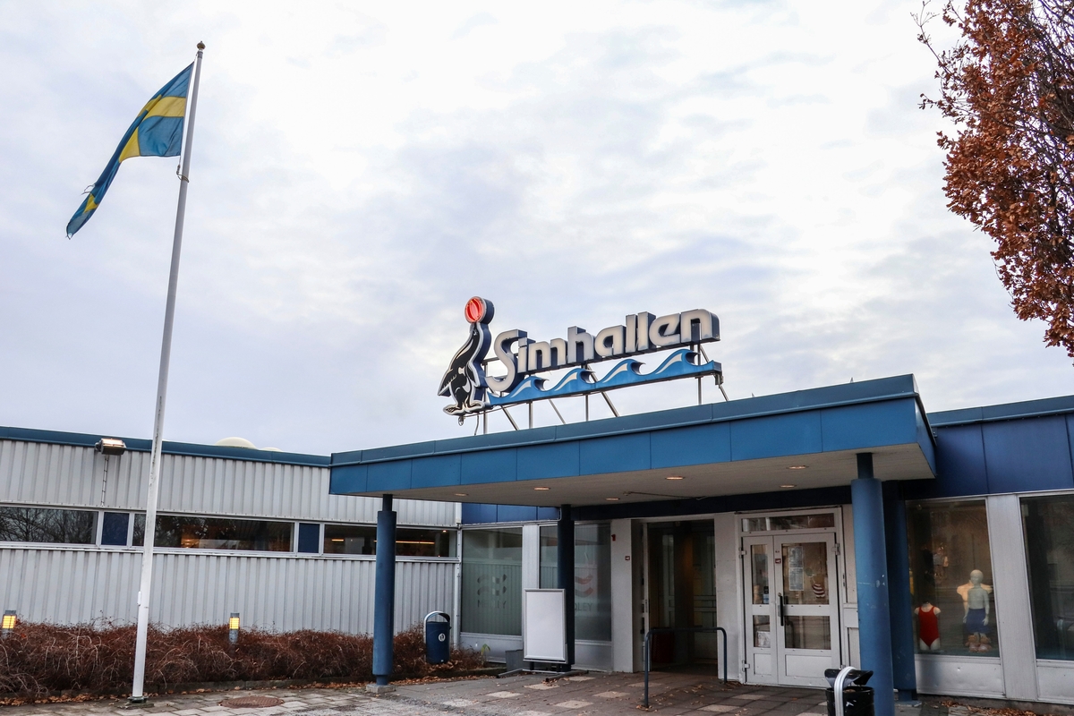 Bilder från Linköpings simhall vintern 2021. Vid sidan av simhallen byggs en ny simhall. Vintern 2021 drivs simhallen av Medley.