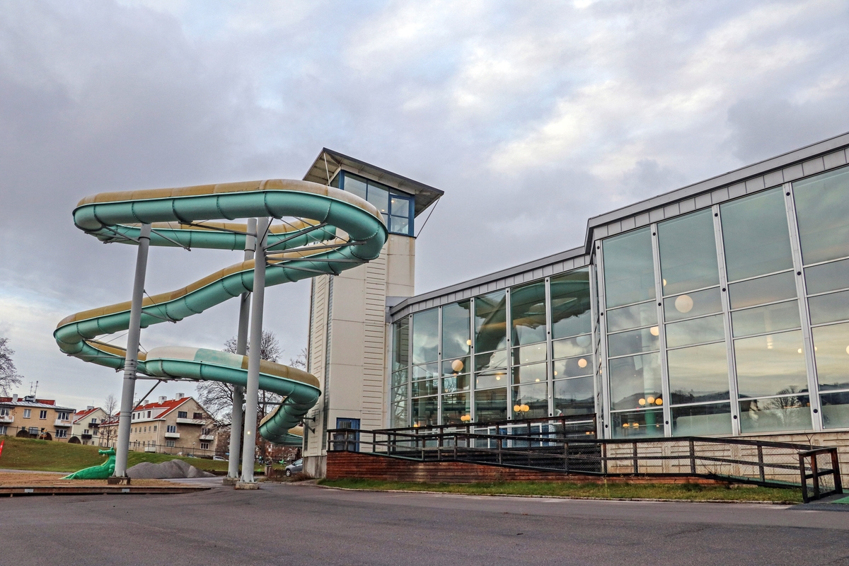 Exteriör mot Tinnerbäcksbadet. Man ser vattenrutschbanan från utsidan.