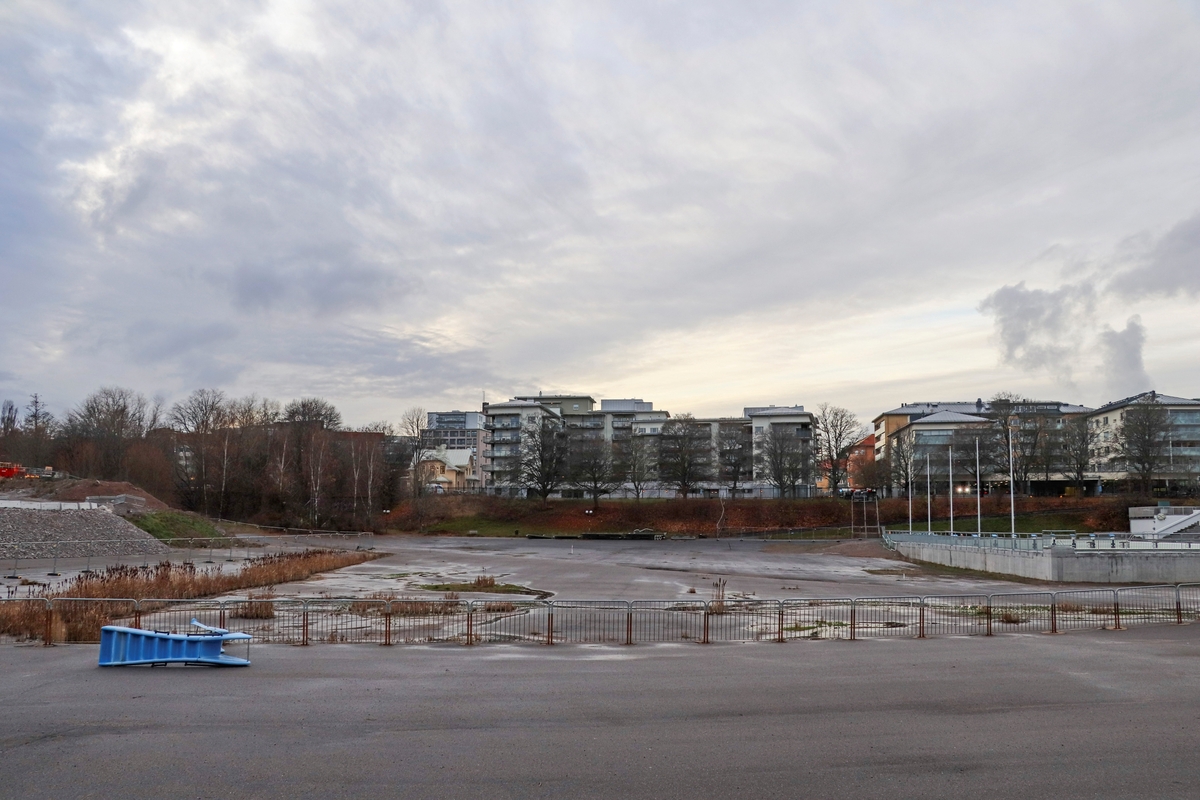 Exteriör mot Tinnerbäcksbadet. Man ser vattenrutschbanan från utsidan. Tinnis badsjö vintertid. Bad. Bilder från Linköpings simhall vintern 2021. Vid sidan av simhallen byggs en ny simhall. Vintern 2021 drivs simhallen av Medley.