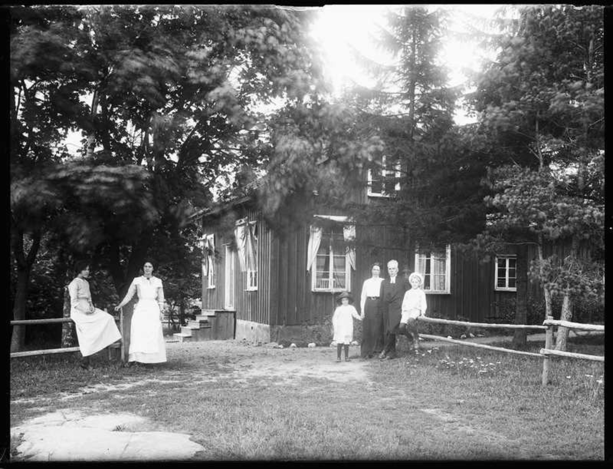 Fotot taget på den gamla prästgården i Tungebo, damerna till vänster okända troligen tjänstefolk. Dottern Astrid född i Vänersborg 1906-03-28, hustrun Sigrid Dorotea född Berg Vänersborg 1874-06-20, pastor Gustaf Wetterlundh född i Rydaholm 1855-03-15 och sonen Sune född i Vänersborg 1904-02-11.