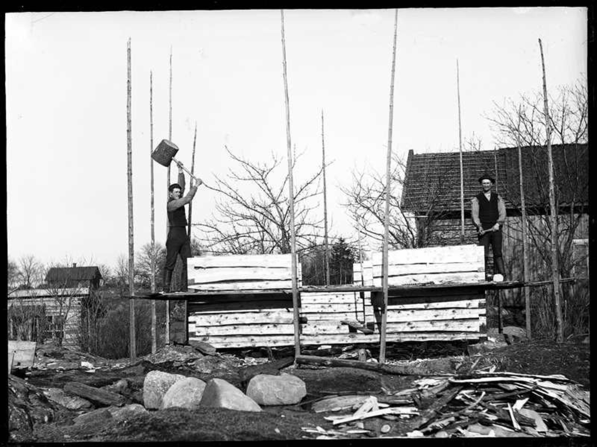 Abraham Jonsson, Hjärtum 1875-01-13, och Johan Jonsson, Hjärtum 1880-11-01, laftar upp timret till den nya timrade ladugården på Torpet (Arnstorp). I bakgrunden syns det rödmålade boningshuset i Brevik, nuvarande Brevik 1:28. Abraham har en hemtillverkad slägga och Johan håller i en timmermansyxa. Bakom Johan syns det gamla boningshuset på Torpet (Arnstorp).