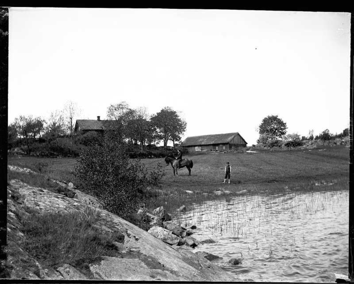 Vy över den gamla gården Brevik med rödmålat boningshus och ladugård med halmtak, i förgrunden syns en av pojkarna i Brevik till häst och en annan pojke troligen Ernst Johansson, Hjärtum 1895-10-12, stående barfota vid strandkanten.
