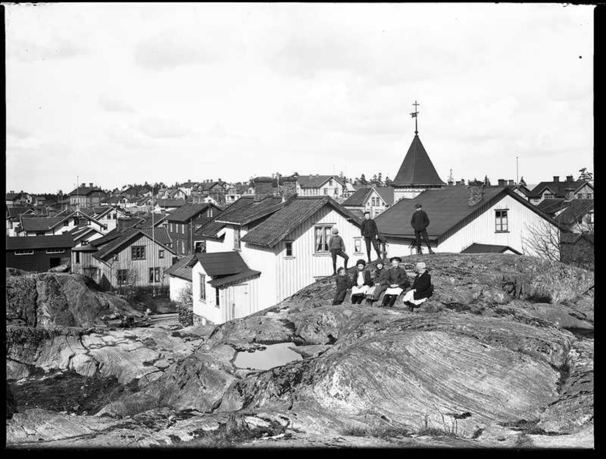 Vy över Strömslund - bilden tagen från en bergknalle sydväst om Missionskyrkan och innan kvarteret Eddan byggdes. I förgrunden syns Missionskyrkan och husen i kvarteret Ran. I bakgrunden kan man bl a se skolbyggnaden och Gustaf Svenssons hus beläget i korsningen Torsredsvägen / Strömslundsgatan.