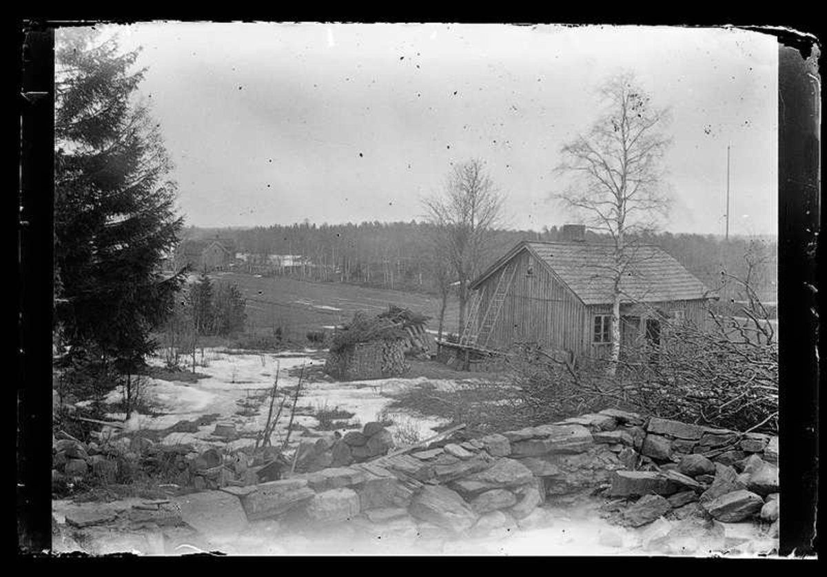 Olof Jonssons bostadshus omålat men troligen med tvåkupigt tegel. Två stegar är resta mot huset och på marken finns staplar med tegelpannor. Bilden är tagen innan vägen mellan Sågbron och Nötbron, Fjällvägen byggdes. I förgrunden på bilden syns utlagda stenar, troligen grundmur till tillbyggnaden på ladugården.
