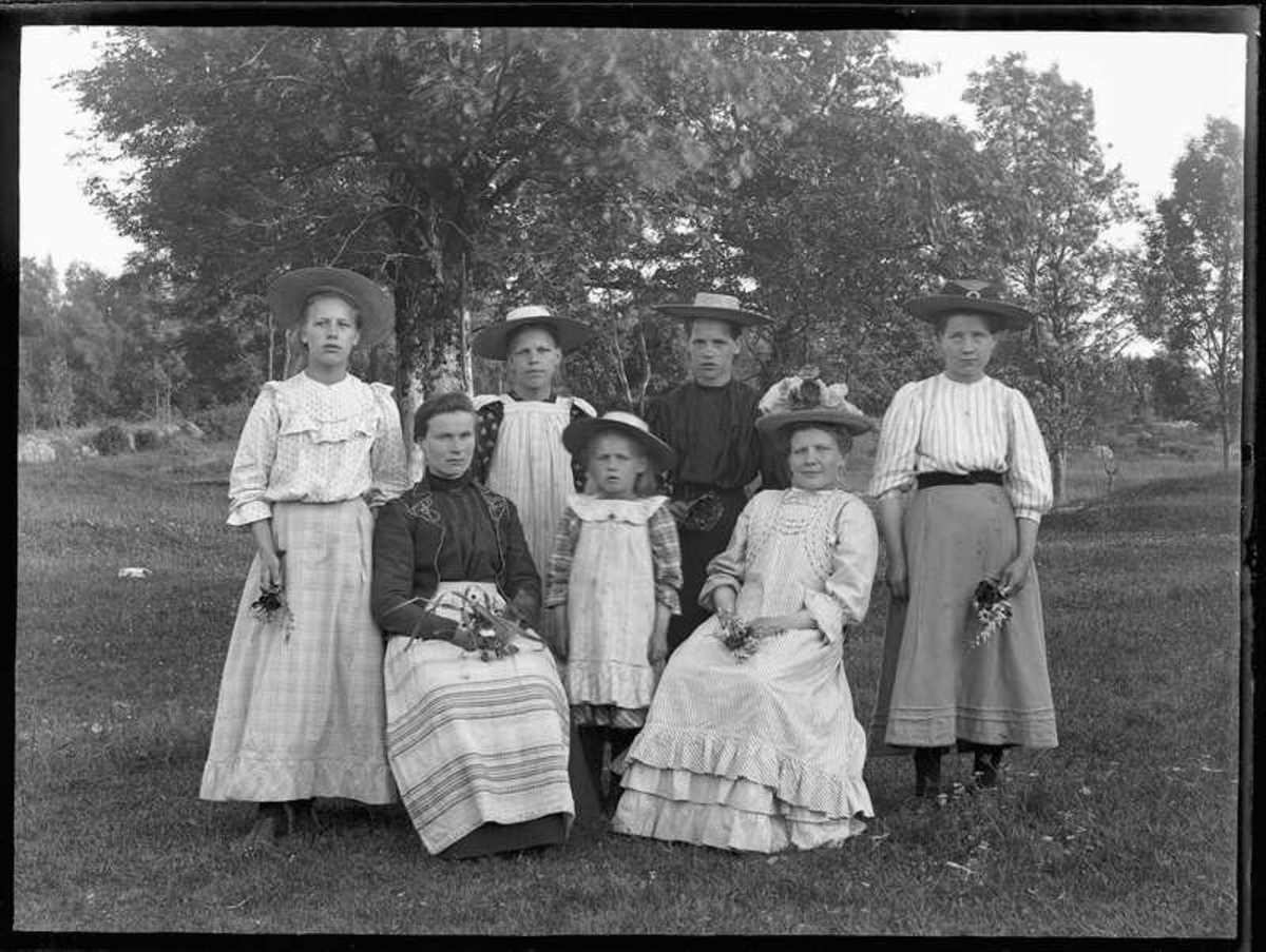 Gerda Johansson, Hjärtum 1893-10-15, Jeanna Jonsson, Hjärtum 1874-04-03, Signe, Johansson, Hjärtum 1896, Hilda Johansson, Hjärtum 1900-04-27, Okänd, Anna Johansson, Hjärtum 1891-01-05, Okänd i trädgården på Torpet (Arnstorp)