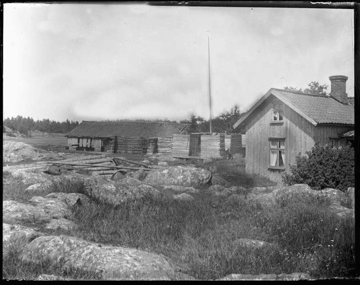 Vy över boningshuset på Arnstorp och den gamla ladugården syns till vänster på bilden. På bilden syns också flaggstången och timret till ny ladugård på Arnstorp som laftats upp innan den skall monteras på sin rätta plats.