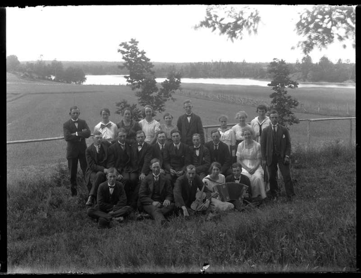 Olofs text: Grupp från ? i Gräsviken. Stående: nr 7 är Ester Andersson från Gräsviken, Vassenda-Naglum, nr 9 är Ellen Johansson från Lärsbo, Hjärtum, sittande (mitten) nr 3 är Anders Andersson från Gräsviken, Vassenda-Naglum, nr 5 Rudolf Johansson från Lärsbo, Hjärtum, raden längst fram nr 3 Ivar Johansson från Lärsbo, Hjärtum, nr 5 Artur Johansson från Lärsbo, Hjärtum