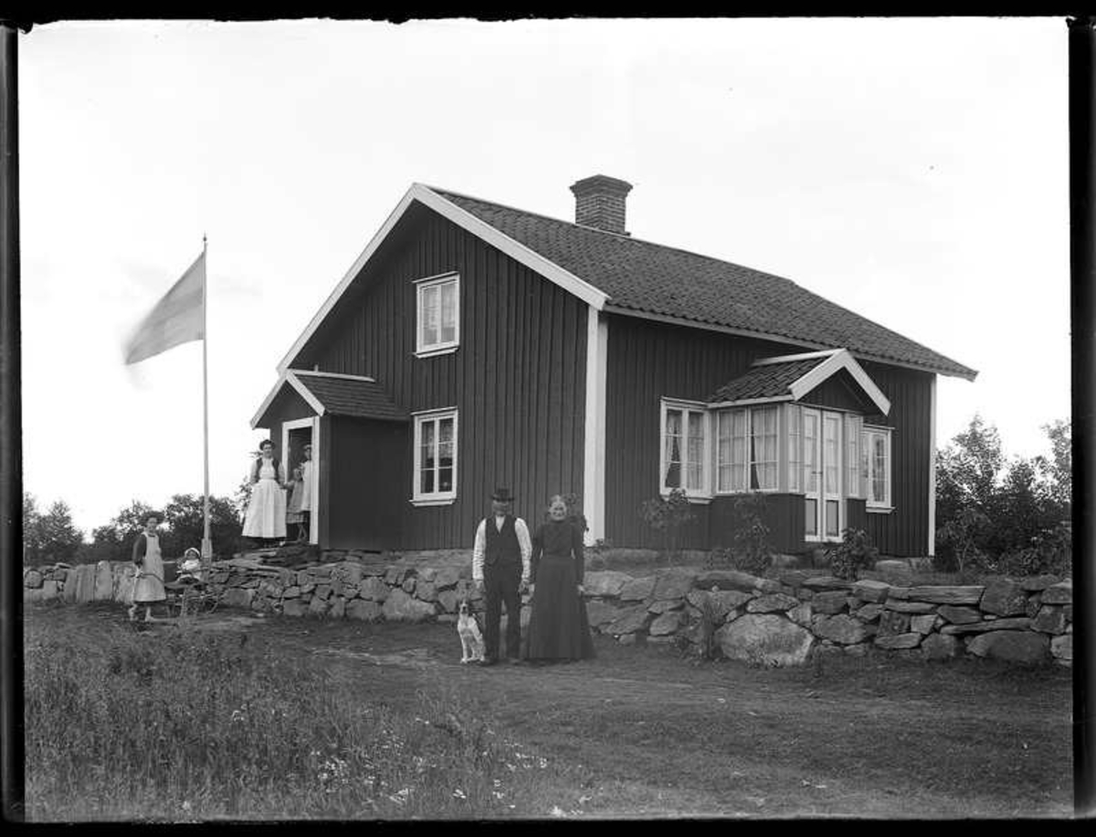 Leander Anderssons rödmålade bostadshus med vita knutar och enkupigt tegel på taket. Karlinders barn med barnjungfru och barnvagn. Gerda Johansson Hjärtum 1893-10-15, Lars Gustaf Karlinder Trollhättan 1908-06-05, Jenny Andersson, Hjärtum 1884-10-10, Ingeborg Margareta Karliner Trollhättan 1901-04-23, Anna Lisa Karlinder Högbo 1896-06-25, Leander Andersson Naglum 1853-09-28, hans hustru Anna Kristina Andersdotter Stala 1848-07-05.