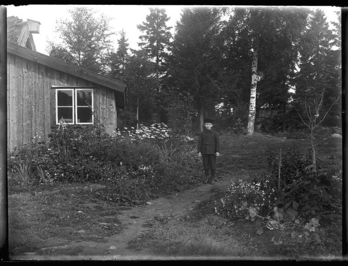 Framför påbyggnaden till ladugården på Torpängen, före landsvägen byggdes mellan Sågbron och Nötbron, Fjällvägen står Erik Jonsson, Hjärtum 1919-07-26,