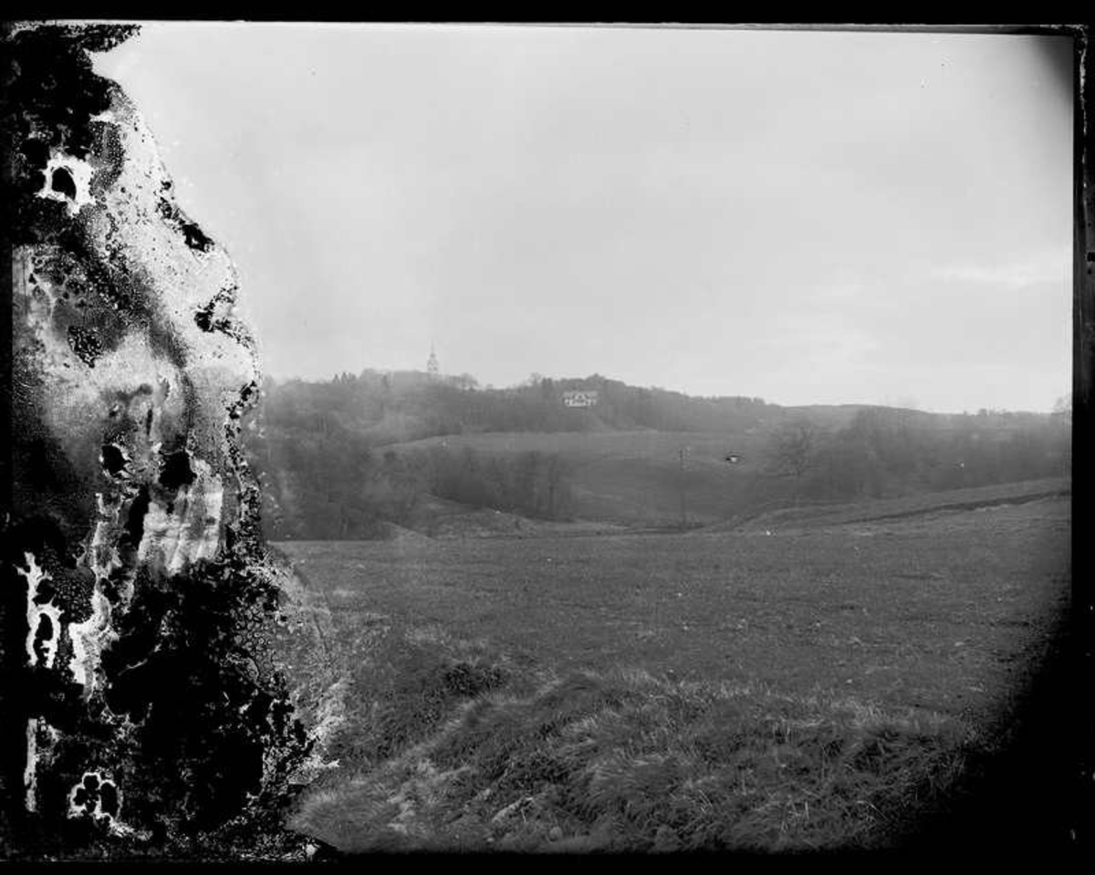 Vy med Hjärtums kyrka och prästbostaden i bakgrunden