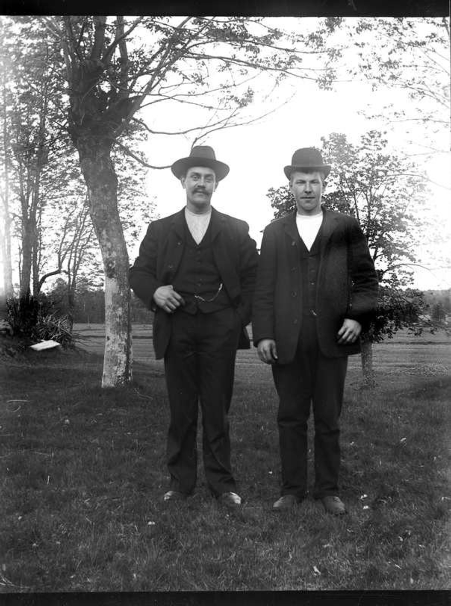Karl Fredrik Johansson, Hjärtum 1874-03-08 och Karl Andreasson, Hjärtum 1886-04-13. Bilden tagen i trädgården på torpet Arnstorp.