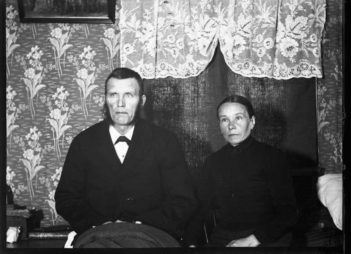 På bilden sitter Josef Nilsson, Herrestad f1857-12-04, och hans hustru Anna Ulrika Andreasdotter, Forshälla f1856-01-27. Bilden troligen tagen inne i boningshuset i Lunden, Ingelstorp.