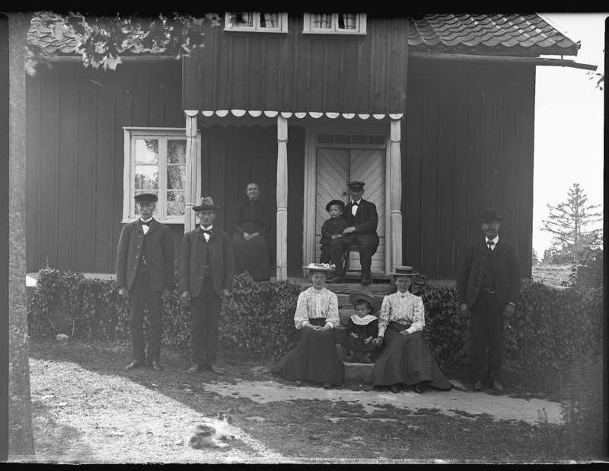 Familjen Karl Anton Magnusson på besök hos hustrun Huldas familj i Kyrkobyn. Troligen Huldas bröder Karl Oskar Augustsson (smed) Väne-Ryr 1886-11-20, Johan Viktor Augustsson (smed) Väne-Ryr 1882-09-12, modern Inga Maja Andreasdotter, Bäve 1849-02-12, Huldas son Karl Enar Josef, Väne-Ryr 1910-05-17 tillsammans med Huldas far, smeden August Augustsson, Väne-Ryr 1839-12-24, troligen Huldas syster Beda Ottilia Augustsson, Väne-Ryr 1889-10-05, Huldas dotter Margareta Sofia Ingegerd, Väne-Ryr 1914-11-07, Hulda Sofia Magnusson född Andreasson Väne Ryr 1884-10-01, och stående längst till höger Huldas make Karl Anton Magnusson, Malma 1877-09-18
