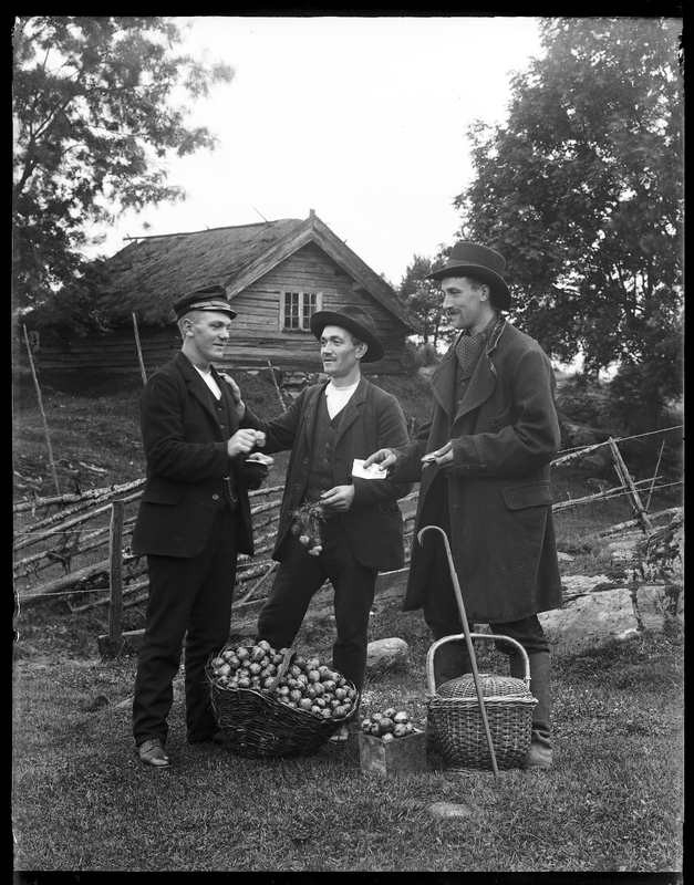 Karl Johansson, Hjärtum 1888-05-14, köper äpplen på Torpet (Arnstorp) av två okända män. I bakgrunden syns källarbyggnaden på Torpet (Arnstorp)