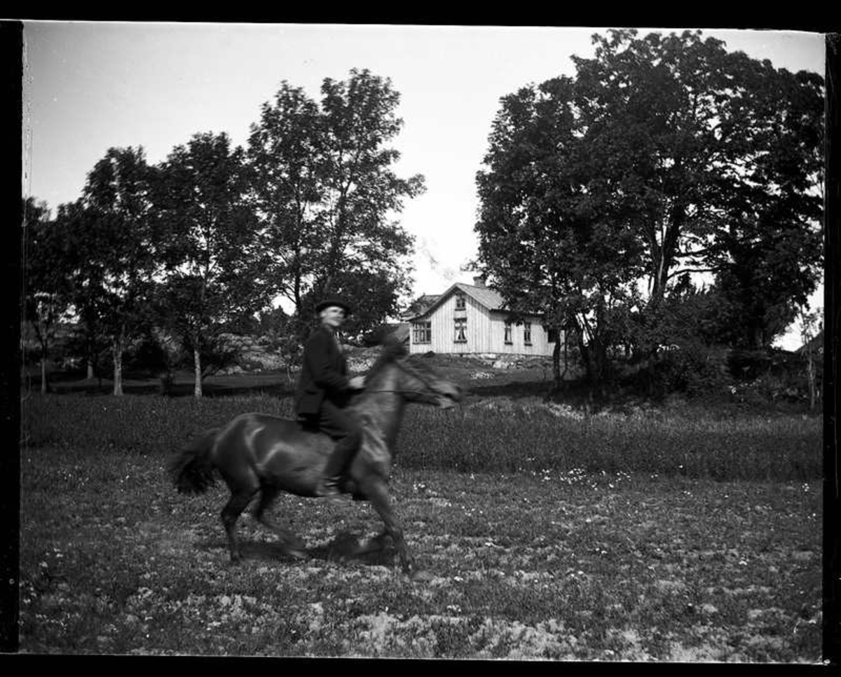 En av bröderna Jonsson rider barbacka på hästryggen. Boningshuset på Torpet (Arnstorp) syns i bakgrunden.