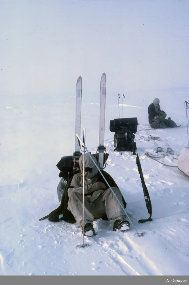 Titel: I provisoriskt skydd för vinande kall fjällvind bakom ryggsäck och träskidor (Vita blixten).