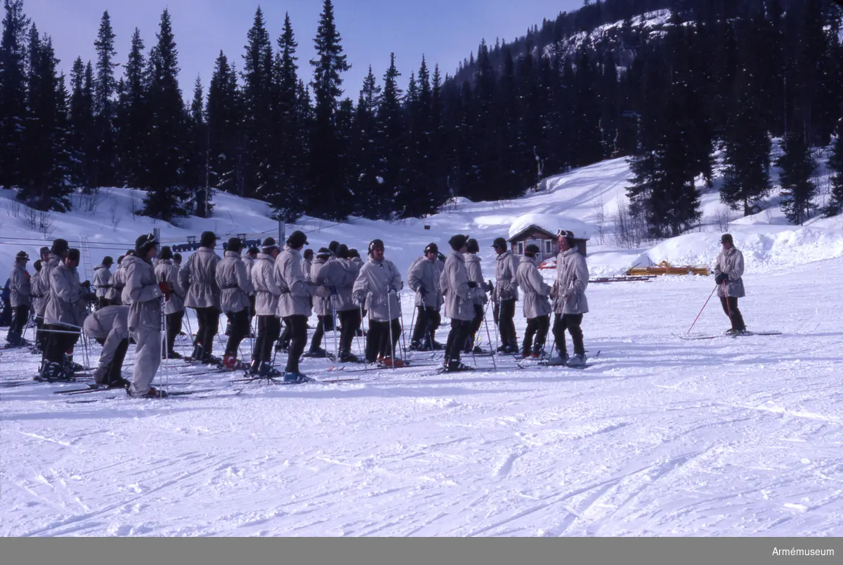 Slutdestination Ammarnäs fjällby med några dagars vila och tilldelning av vällagad husmanskost som motvikt till svältkosten på fjället. Livskvadronen uppställd med Kronans Elanskidor inför avslutande åk i Ammarnäs slalompister.