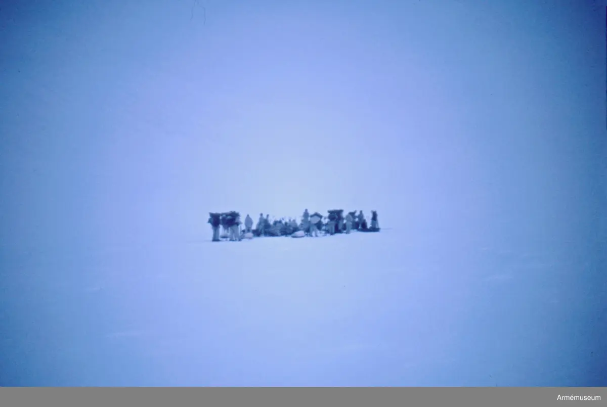 Titel: Jägarplutonens åtskilda grupper samlas i fjälldal inför skymningens blå timma och nattläger.