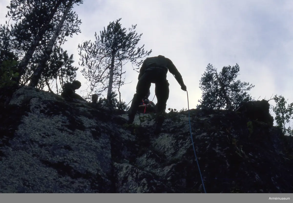 Titel: Övning i bergsklättring med rep utmed klippvägg.