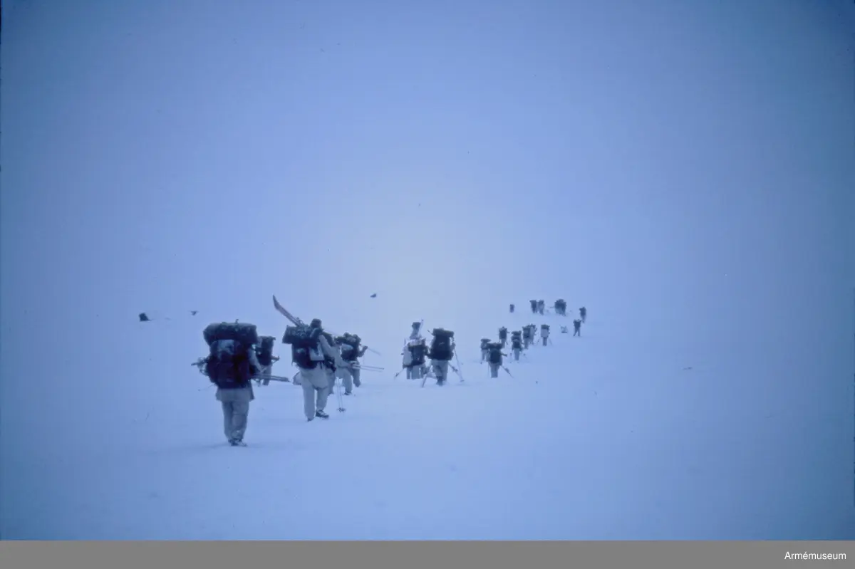Titel: Jägarplutonens åtskilda grupper samlas i fjälldal inför skymningens blå timma och nattläger.
