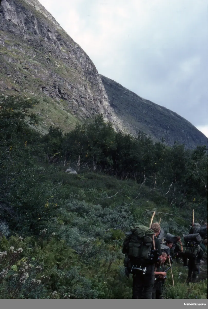 Fjällbranter passeras med vandringsstavarna fastspända på ryggsäckarna. Egentillverkad vandringsstav var obligatorisk för varje soldat då den även hade funktion som tältpinne för de tältdelar som sammanfogades till ett minitält för två soldater (Två vandrings-stavar/tält).