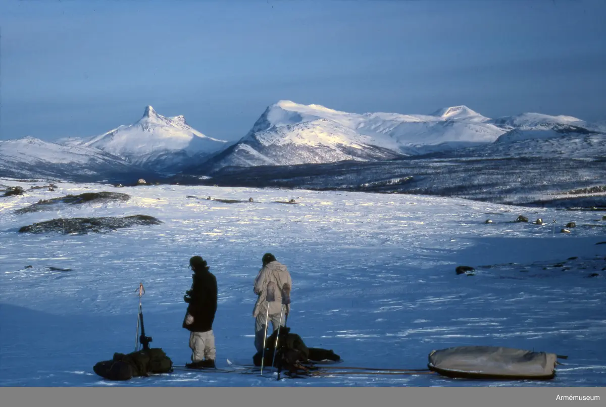 Rast med norska fjälltoppar i bakgrunden. Svordomspulkan drogs av två man. Vid djup snö spårade två skidlöpare framför pulkdragarna.