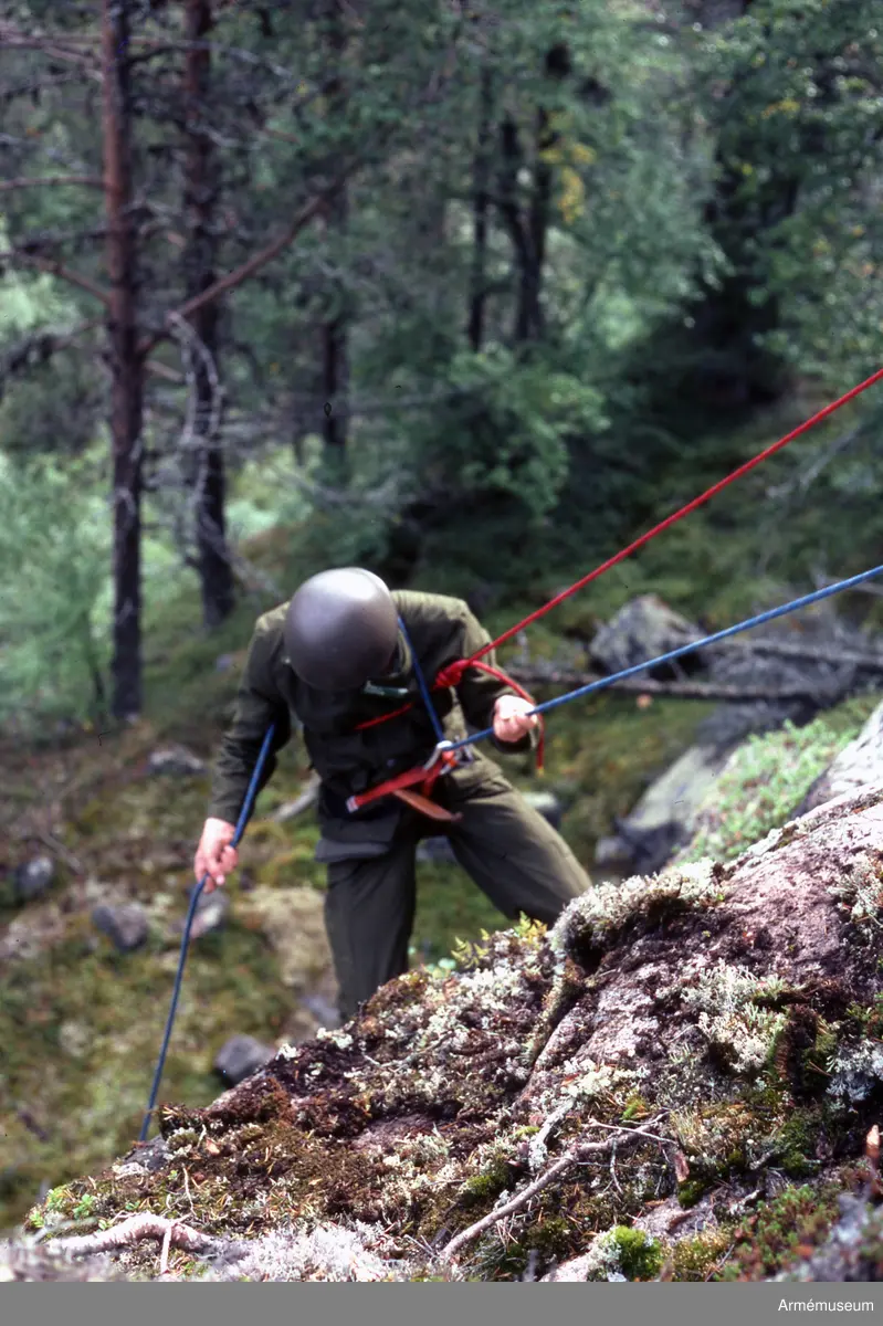 Titel: Övning i bergsklättring med rep utmed klippvägg.
