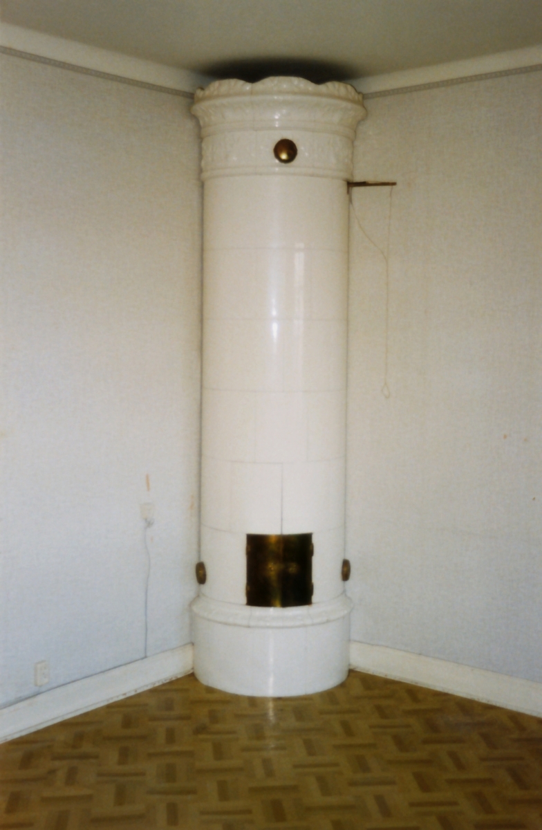Bild 1. En av husets två kakelugnar, här i stora rummet på nedervåningen.