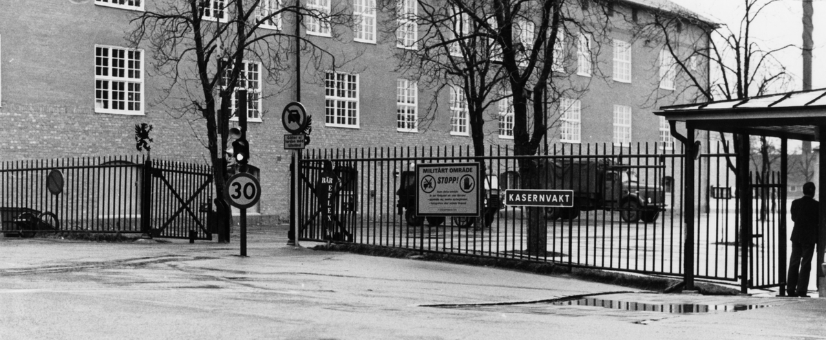 Bild 1: Denna vy mötte man från Regementsgatan. Bilarna som parkerats mot kasern 003 tillhörde vakten och beredkapsstyrkan.