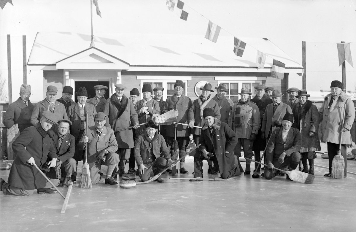Serie bilder med Linköpings curlingklubb. Året var 1931, platsen invid stadens läroverk för flickor (sedermera Elsa Brändströms skola).
