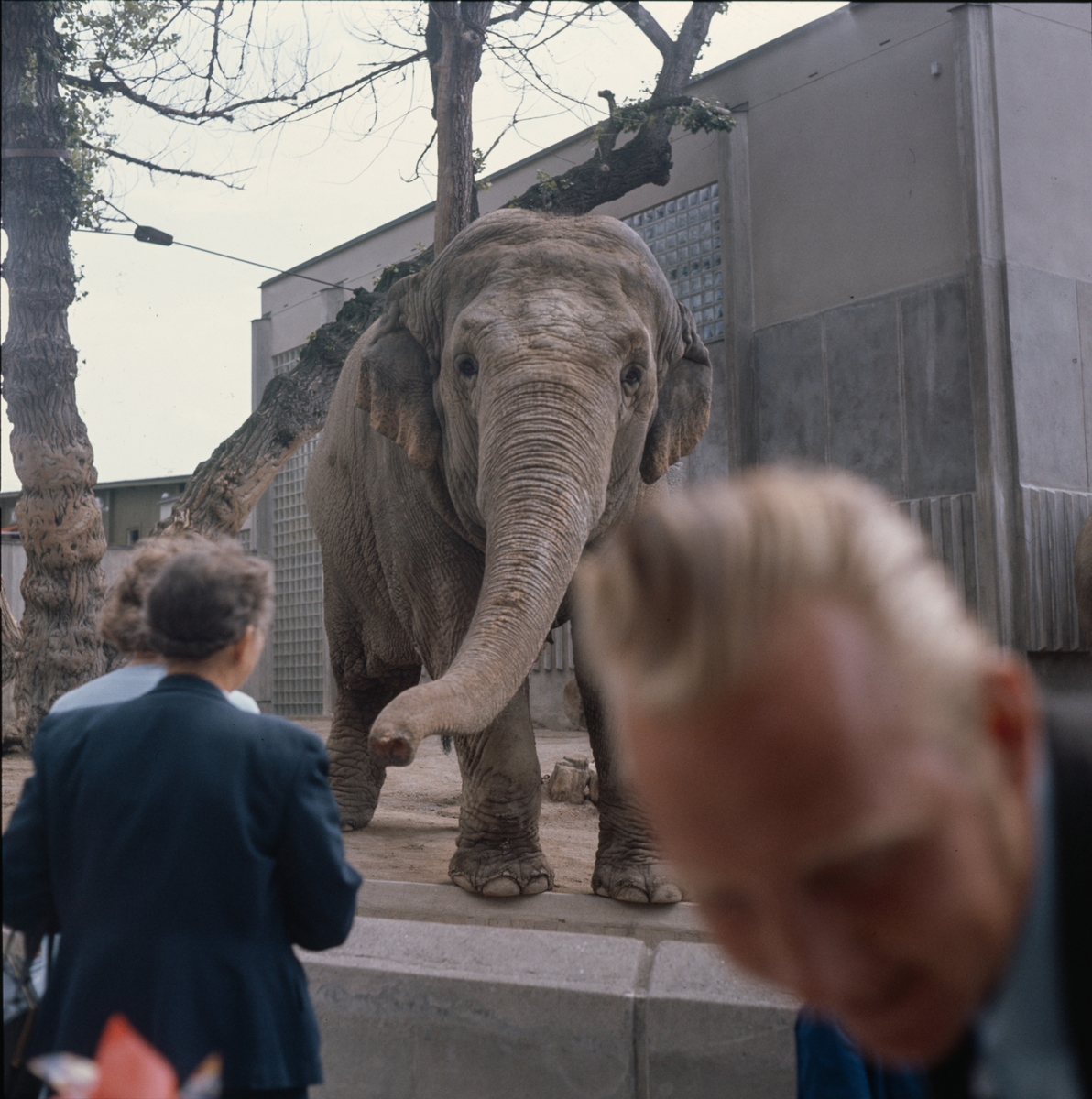 Den Asiatiska elefanten Bambina vid elefanthuset på Skansen. Barn och vuxna besökare.